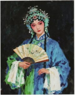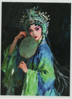无论是高度程式化的面部妆容,还是复杂精致的头饰与服装装饰,他都没有停留在表层的装饰再现,而是通过对笔触、色彩层次与明暗关系的精准控制,使这些视觉符号转化为人物精神状态的组成部分。例如对水袖与披帛的处理,刘晓朋通过渐变与富有方向性的笔触,使静态画面中的布料呈现出柔软而富有暗示性的动态质感,既回应了舞台表演的身体语言,也强化了画面内在的节奏感。